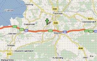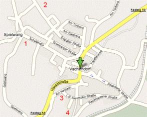 Vachendorf (581 m ü. NN) liegt am Nordrand der Chiemgauer Alpen mit den Hausbergen Hochfelln und Hochgern ( im Hintergrund links bzw. rechts der Kirche), unweit des Chiemsees (6 km entfernt), der Kreisstadt Traunstein (5 km) und Salzburg (30 km). Erreichbar ist Vachendorf über die A 8 München-Salzburg Ausfahrt Bergen oder Schweinbach oder über die B 304 aus Richtung Traunstein.